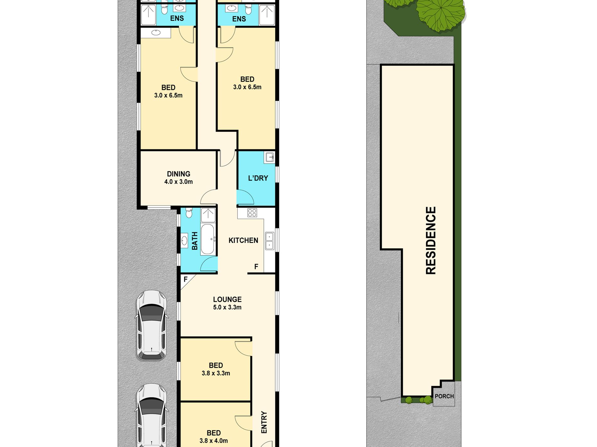 - Side driveway with room for 3 cars