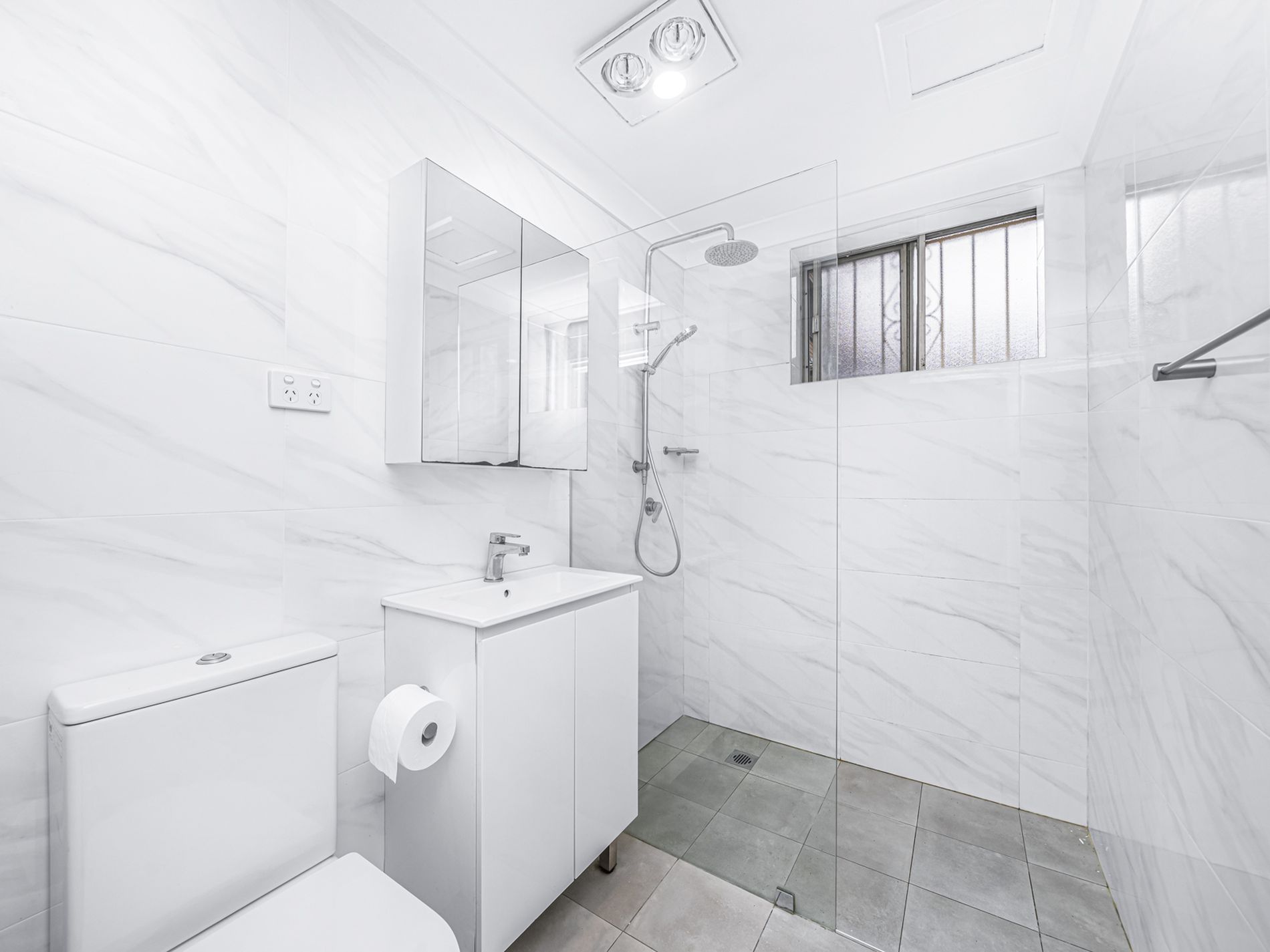 - Near new bathroom with floor to ceiling tiles