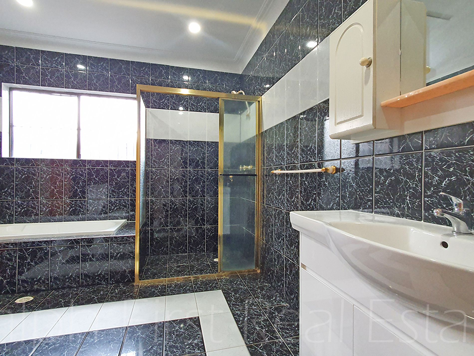 -Over-sized wall to ceiling tiled bathroom with brand new wash basin